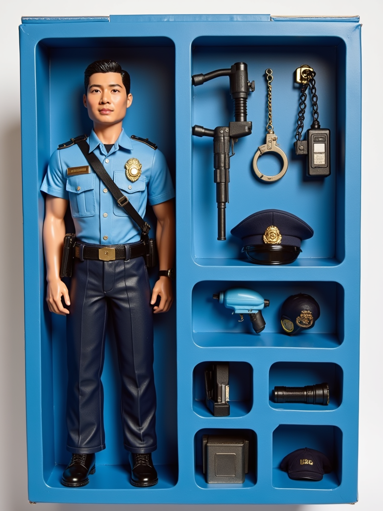 model as an action figure in packaging labeled 'POLICE EDITION'. Use model as a reference for the face. Model is 6 inches tall and dressed in police uniform with badge, and holding a walkie-talkie. The cardboard section should be blue. Include an 'Accessories' section with items like handcuffs, police hat, and flashlight. Make the design visually appealing and reflective of law enforcement profession. Do not include the character image on packaging.