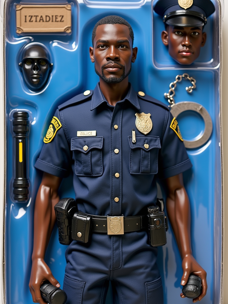 model as an action figure in packaging labeled 'POLICE EDITION'. Use model as a reference for the face. Model is 6 inches tall and dressed in police uniform with badge, and holding a walkie-talkie. The cardboard section should be blue. Include an 'Accessories' section with items like handcuffs, police hat, and flashlight. Make the design visually appealing and reflective of law enforcement profession. Do not include the character image on packaging.