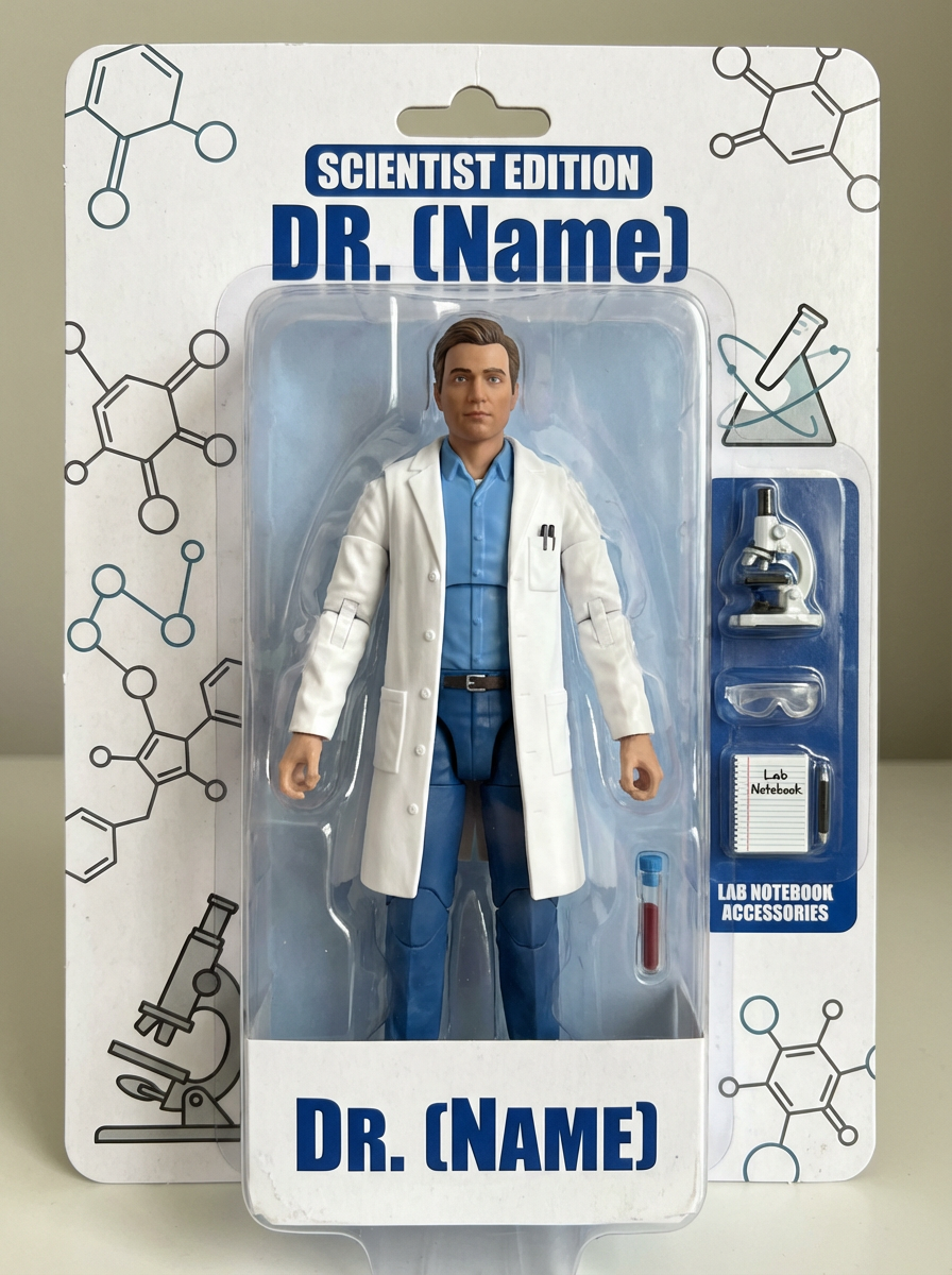 model as an action figure in packaging labeled 'SCIENTIST EDITION'. Use model as a reference for the face. Model is 6 inches tall and dressed in lab coat, and holding a test tube. The cardboard section should be white. Include an 'Accessories' section with items like microscope, safety goggles, and lab notebook. Make the design visually appealing and reflective of scientific research. Do not include the character image on packaging.