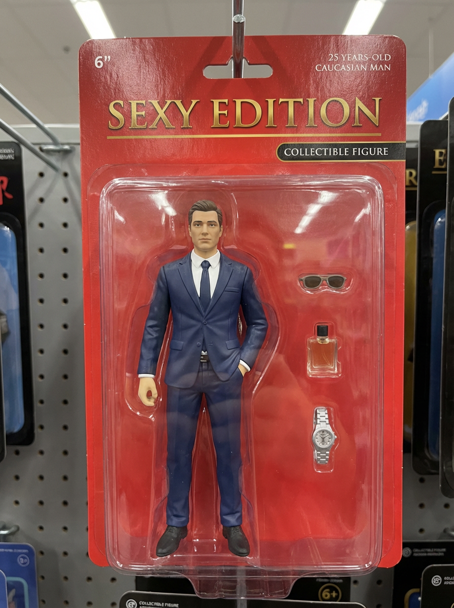 model as an action figure in packaging labeled 'SEXY EDITION'. Use model as a reference for the face. Model is 6 inches tall and dressed in suit and tie outfit, and striking a confident pose. The cardboard section should be red. Include an 'Accessories' section with items like sunglasses, perfume/cologne bottle, and elegant watch. Make the design visually appealing and alluring. Do not include the character image on packaging.