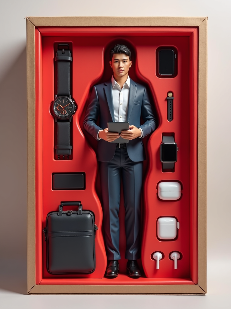 model as an action figure in packaging labeled 'STARTUP EDITION'. Use model as a reference for the face. Model is 7 inches tall and dressed in business casual attire, and holding a tablet. The cardboard section should be red. Include an 'Accessories' section with items like briefcase, smart watch, and wireless earbuds. Make the design visually appealing and reflective of a startup environment. Do not include the character image on packaging.
