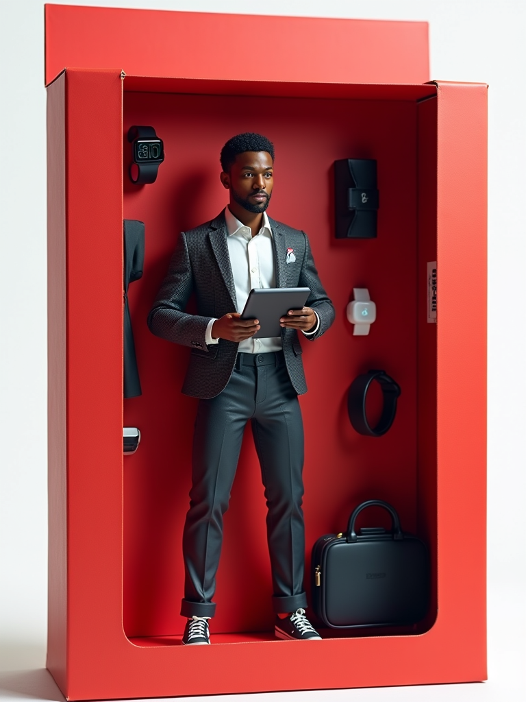model as an action figure in packaging labeled 'STARTUP EDITION'. Use model as a reference for the face. Model is 7 inches tall and dressed in business casual attire, and holding a tablet. The cardboard section should be red. Include an 'Accessories' section with items like briefcase, smart watch, and wireless earbuds. Make the design visually appealing and reflective of a startup environment. Do not include the character image on packaging.