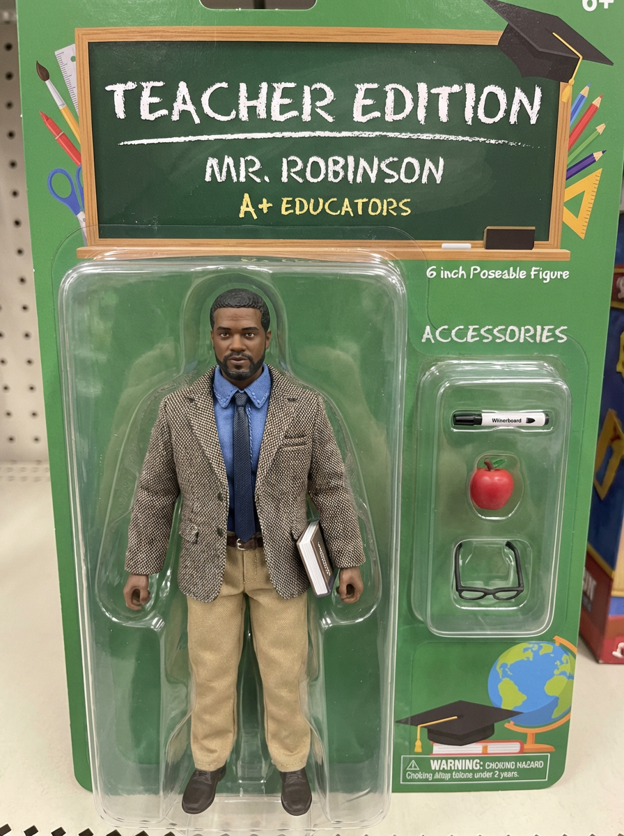 model as an action figure in packaging labeled 'TEACHER EDITION'. Use model as a reference for the face. Model is 6 inches tall and dressed in professional teaching attire, and holding a book. The cardboard section should be green. Include an 'Accessories' section with items like whiteboard marker, apple, and reading glasses. Make the design visually appealing and reflective of education profession. Do not include the character image on packaging.