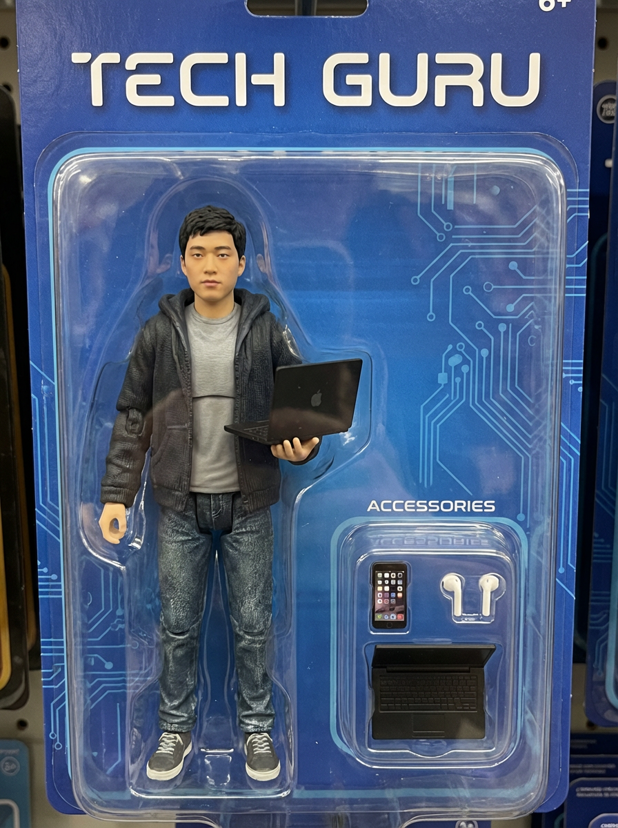 model as an action figure in packaging labeled 'TECH GURU'. Use model as a reference for the face. Model is 6 inches tall and dressed in tech attire, and holding a laptop. The cardboard section should be blue. Include an 'Accessories' section with items like smartphone, laptop, and wireless earbuds. Make the design visually appealing and reflective of tech industry. Do not include the character image on packaging.