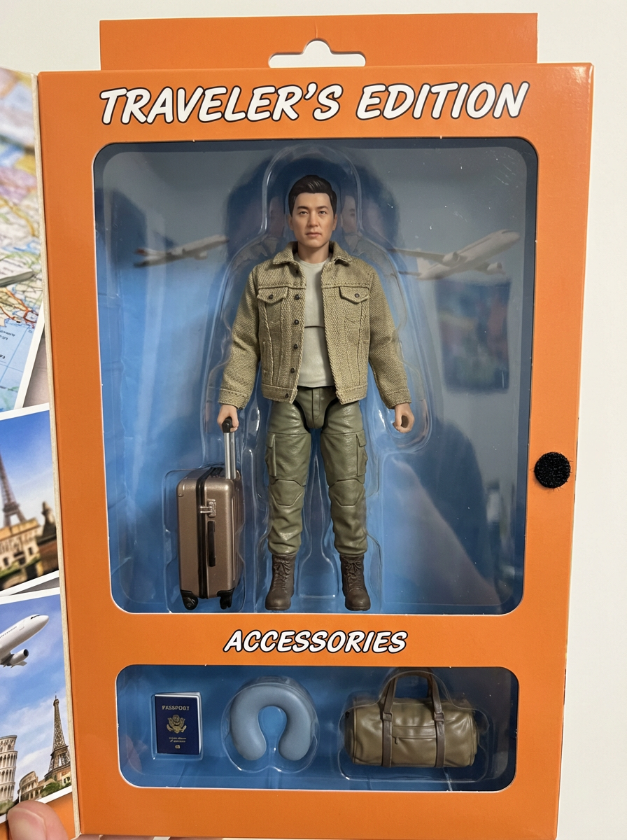 model as an action figure in packaging labeled 'TRAVELER\'S EDITION'. Use model as a reference for the face. Model is 6 inches tall and dressed in travel attire, and holding a suitcase. The cardboard section should be orange. Include an 'Accessories' section with items like passport, travel pillow, and travel bag. Make the design visually appealing and reflective of travel lifestyle. Do not include the character image on packaging.