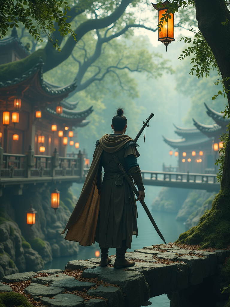 model as an elvish ranger with mystical weapons standing on ancient stone bridges in an elvish tree city with glowing lanterns and magical architecture