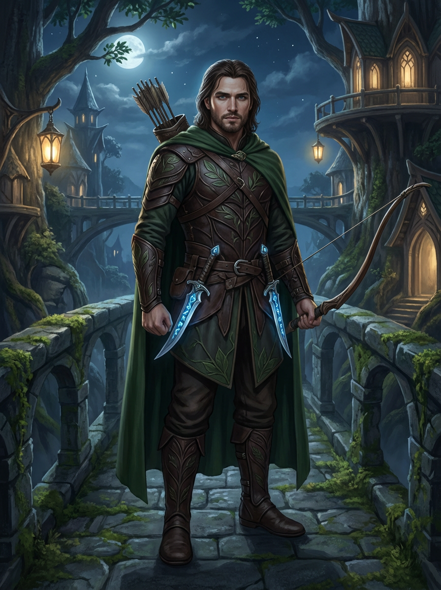 model as an elvish ranger with mystical weapons standing on ancient stone bridges in an elvish tree city with glowing lanterns and magical architecture