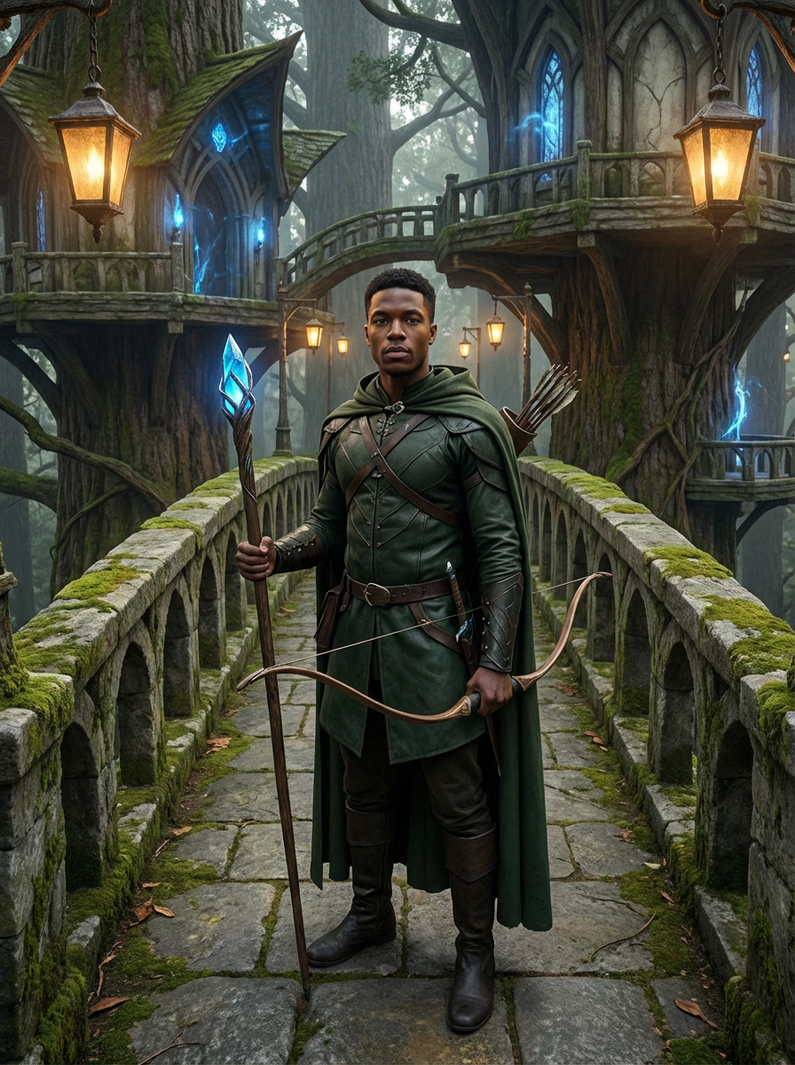 model as an elvish ranger with mystical weapons standing on ancient stone bridges in an elvish tree city with glowing lanterns and magical architecture