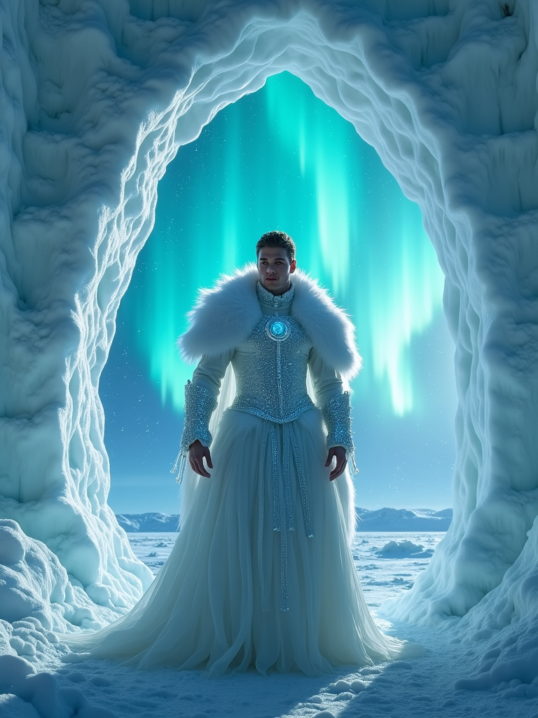 model as an ice king in crystalline armor standing in a frozen fairy palace made of ice and snow with aurora borealis dancing in the background