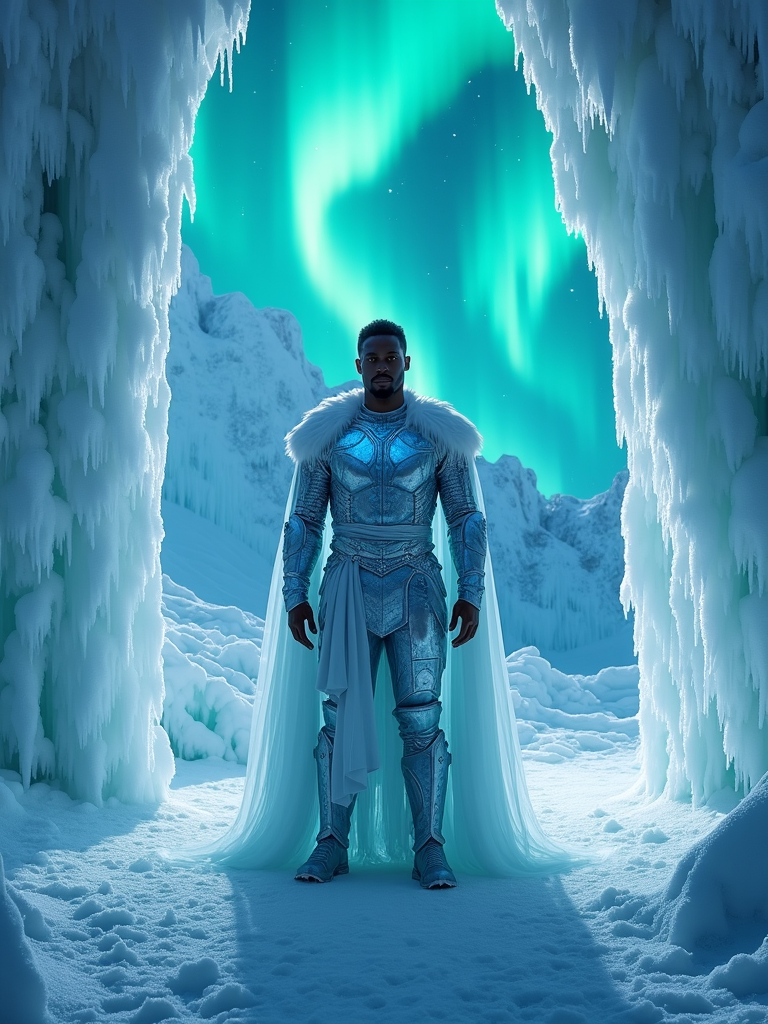 model as an ice king in crystalline armor standing in a frozen fairy palace made of ice and snow with aurora borealis dancing in the background