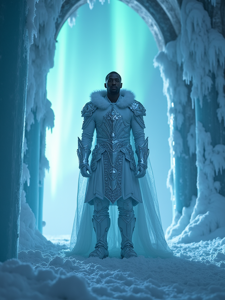 model as an ice king in crystalline armor standing in a frozen fairy palace made of ice and snow with aurora borealis dancing in the background