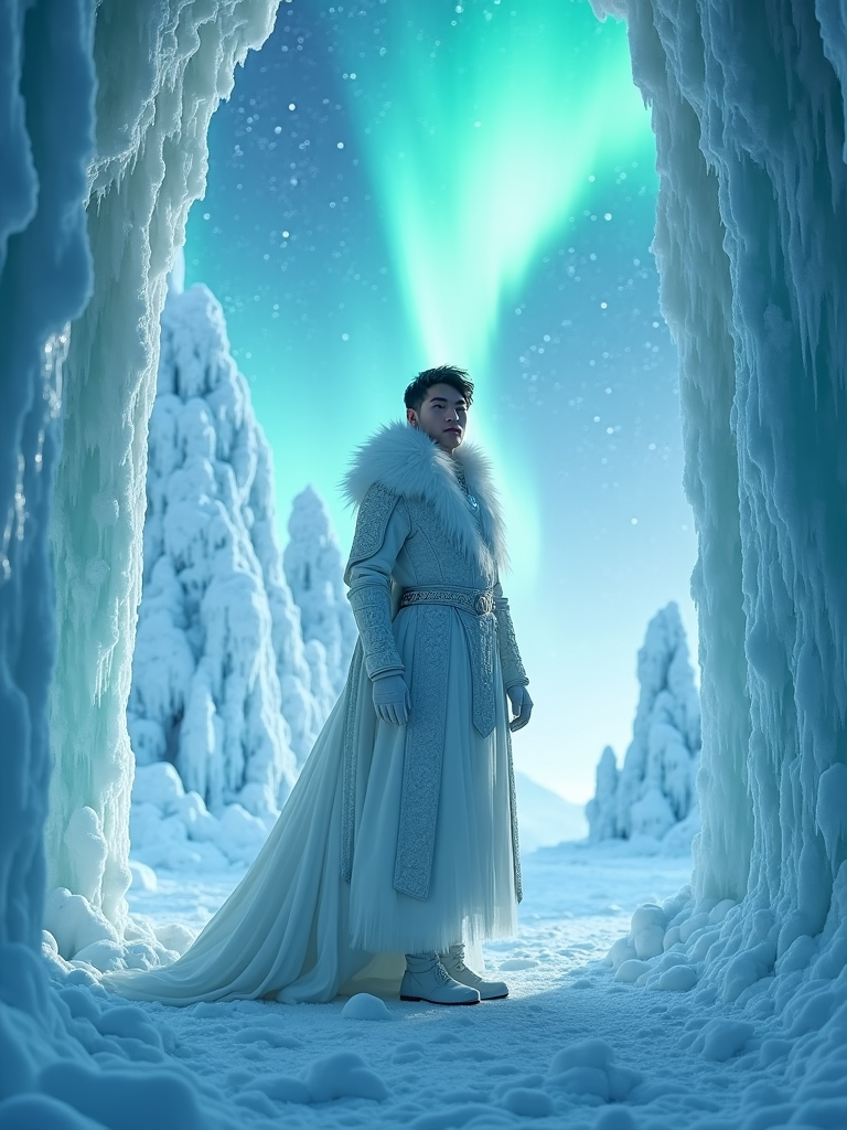 model as an ice king in crystalline armor standing in a frozen fairy palace made of ice and snow with aurora borealis dancing in the background