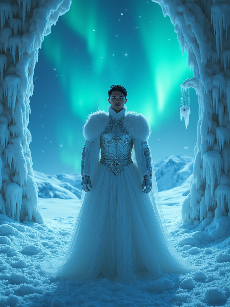 model as an ice king in crystalline armor standing in a frozen fairy palace made of ice and snow with aurora borealis dancing in the background