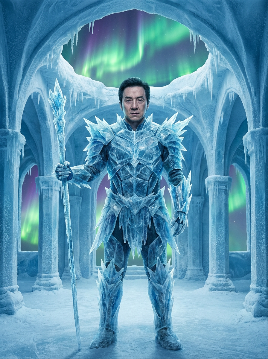 model as an ice king in crystalline armor standing in a frozen fairy palace made of ice and snow with aurora borealis dancing in the background