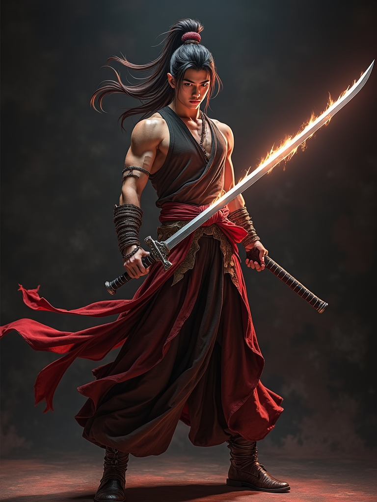 model as anime hero, studio lights, wearing a shonen warrior outfit with oversized sword, dramatic lighting, posing in a power stance