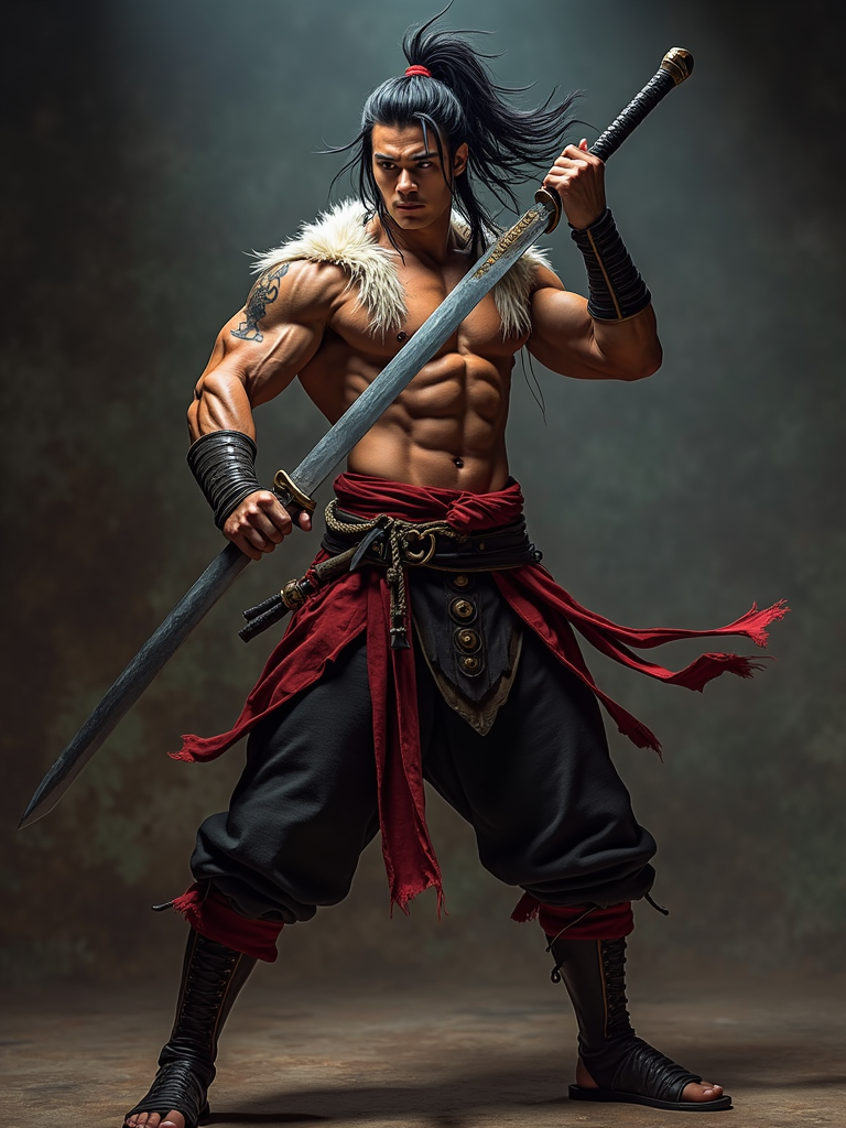 model as anime hero, studio lights, wearing a shonen warrior outfit with oversized sword, dramatic lighting, posing in a power stance