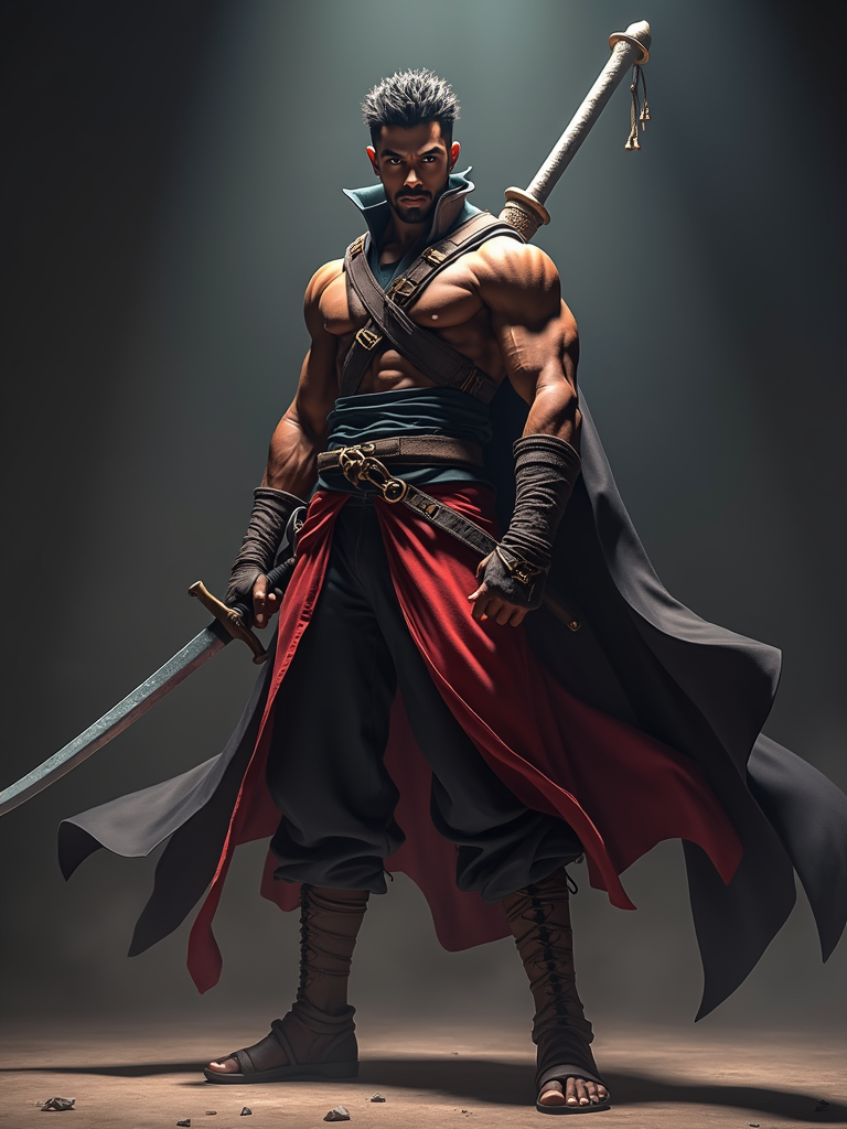 model as anime hero, studio lights, wearing a shonen warrior outfit with oversized sword, dramatic lighting, posing in a power stance