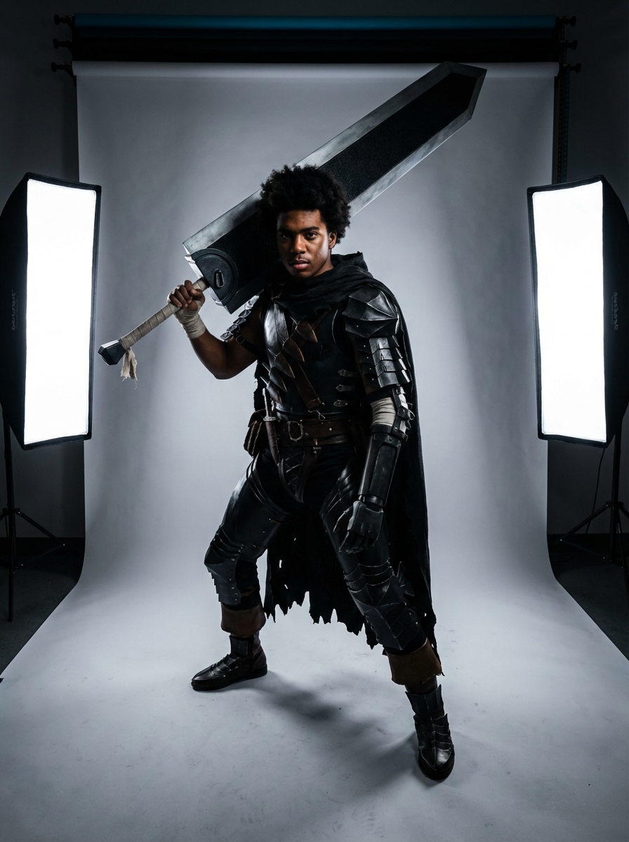 model as anime hero, studio lights, wearing a shonen warrior outfit with oversized sword, dramatic lighting, posing in a power stance