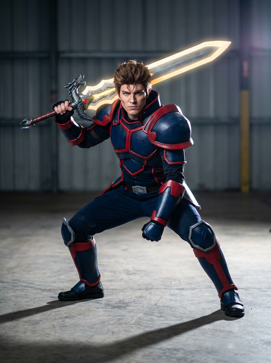 model as anime hero, studio lights, wearing a shonen warrior outfit with oversized sword, dramatic lighting, posing in a power stance