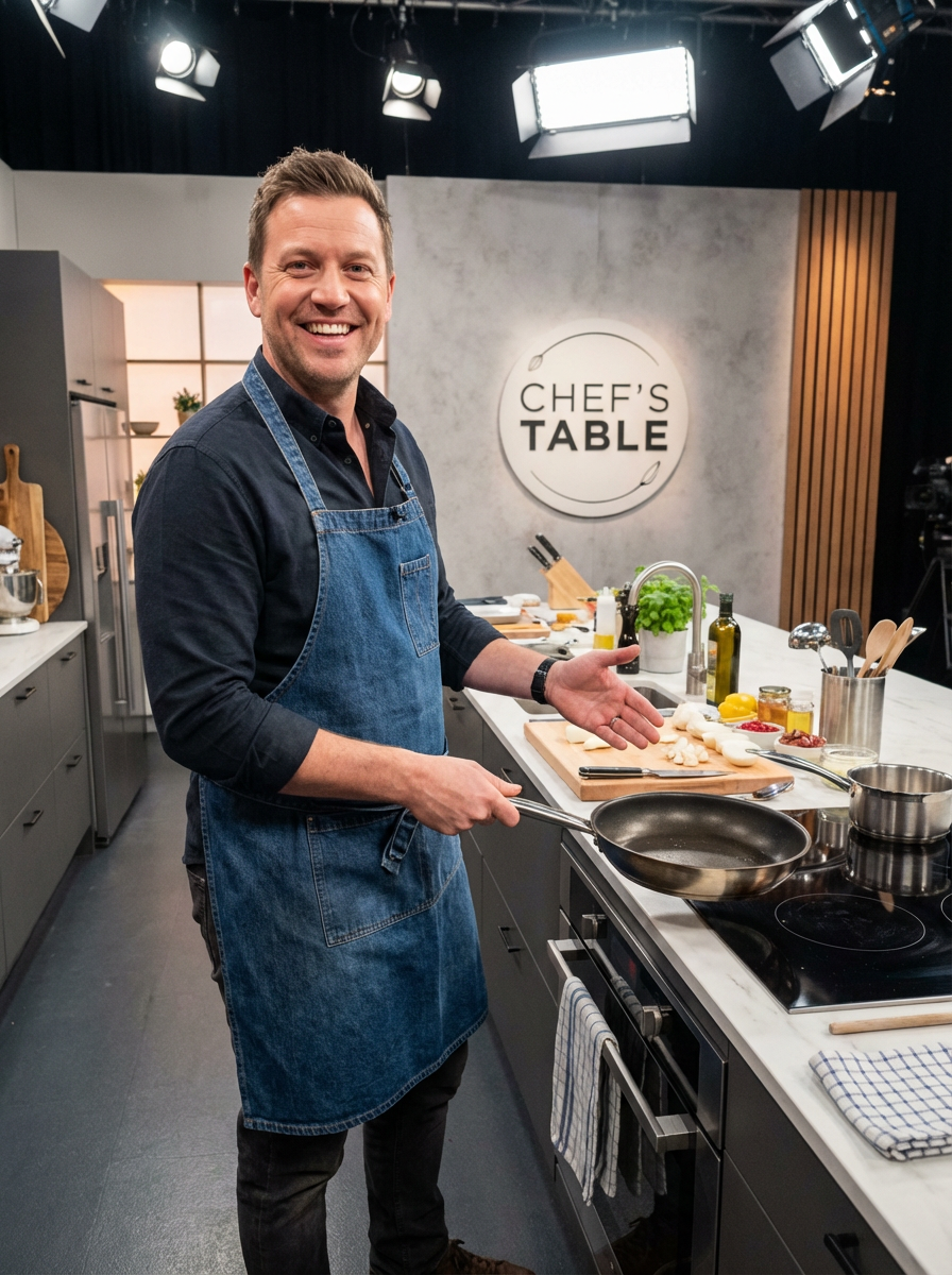 model as celebrity chef style, charismatic expression, stylish chef attire, TV kitchen set aesthetic