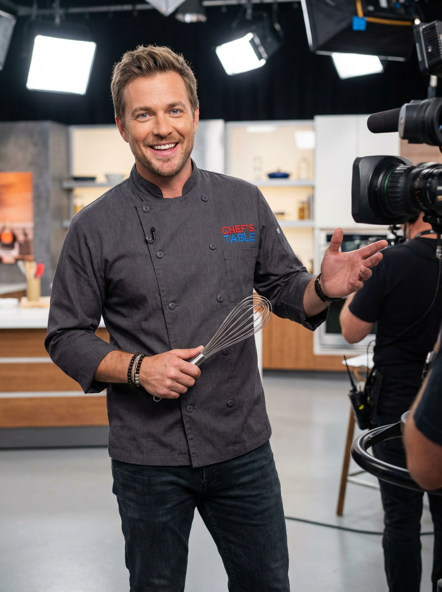 model as celebrity chef style, charismatic expression, stylish chef attire, TV kitchen set aesthetic