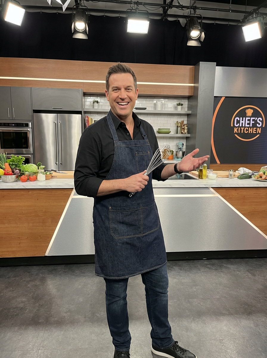 model as celebrity chef style, charismatic expression, stylish chef attire, TV kitchen set aesthetic