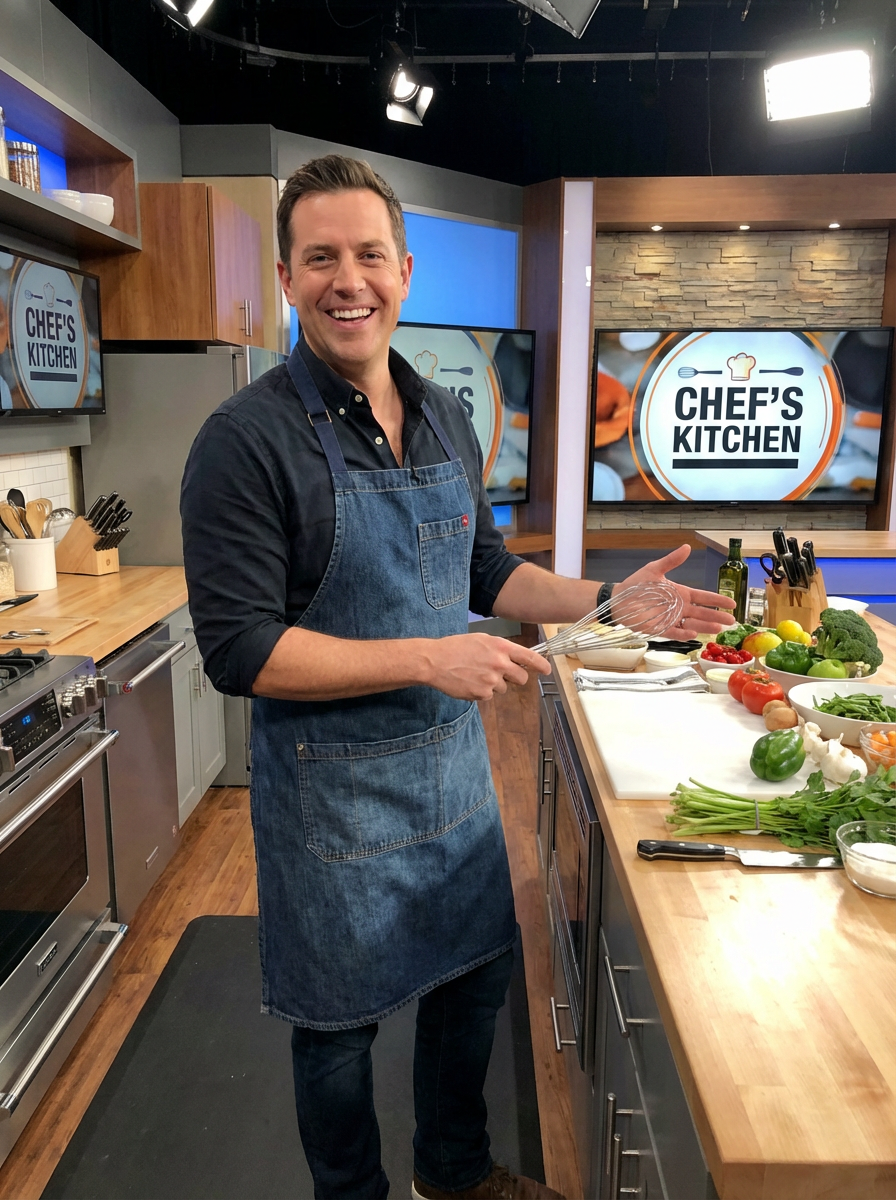 model as celebrity chef style, charismatic expression, stylish chef attire, TV kitchen set aesthetic