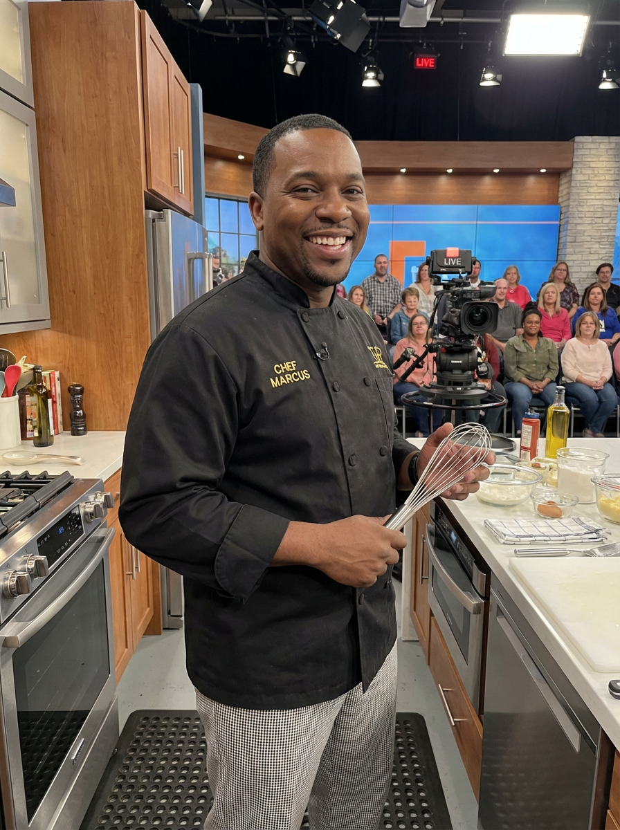 model as celebrity chef style, charismatic expression, stylish chef attire, TV kitchen set aesthetic