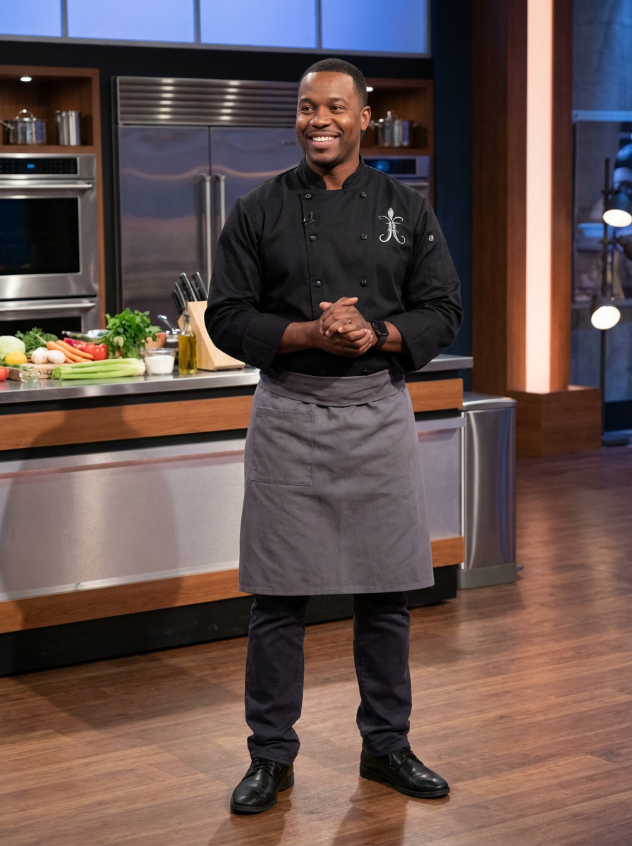 model as celebrity chef style, charismatic expression, stylish chef attire, TV kitchen set aesthetic