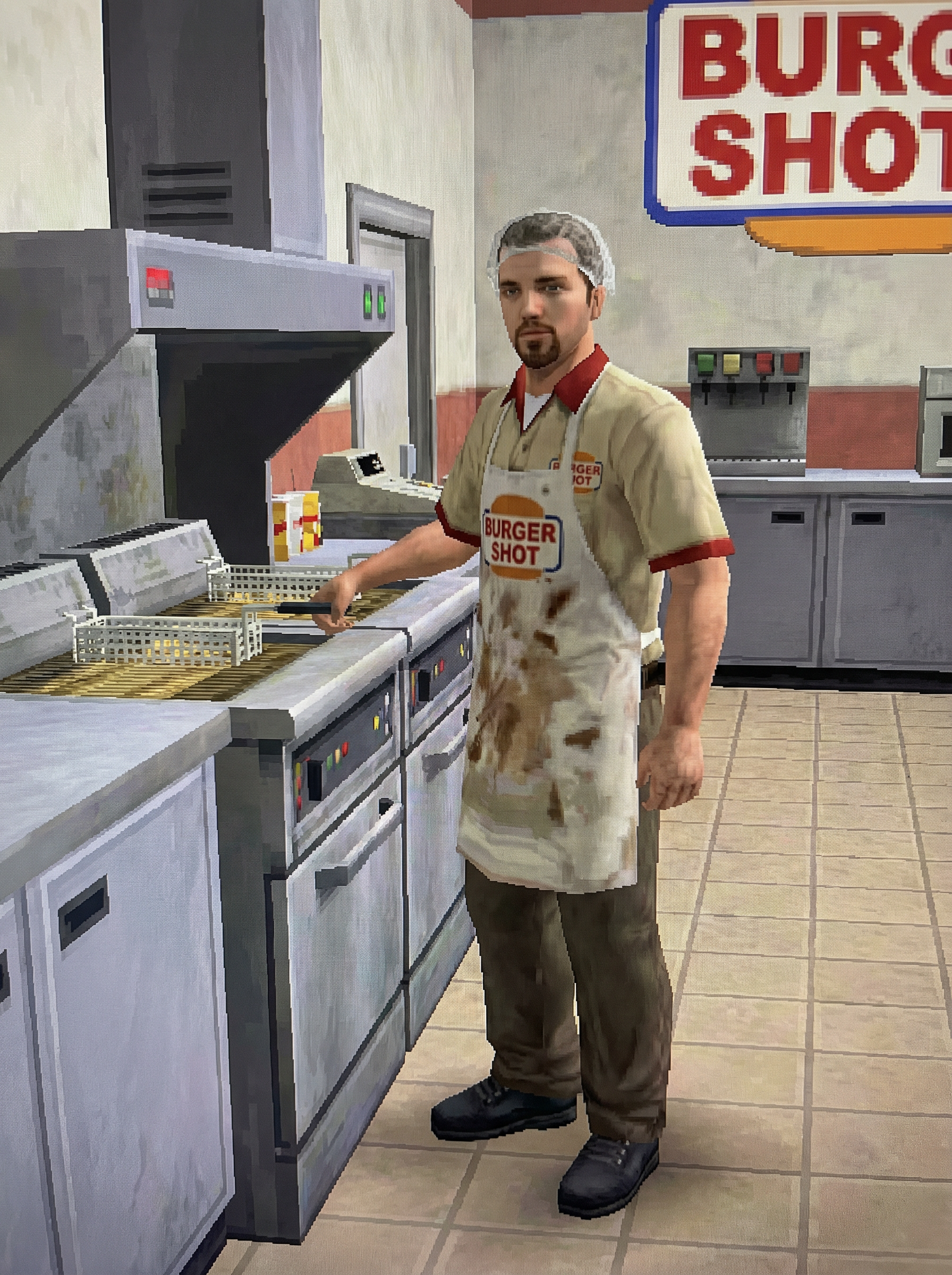 model as character in Grand Theft Auto: San Andreas video game (DO NOT CREATE ILLUSTRATION), in fast food restaurant kitchen, wearing uniform, hair net, apron, non-slip shoes, entire image is in the style of GTA San Andreas (DO NOT MAKE IT A PHOTO)