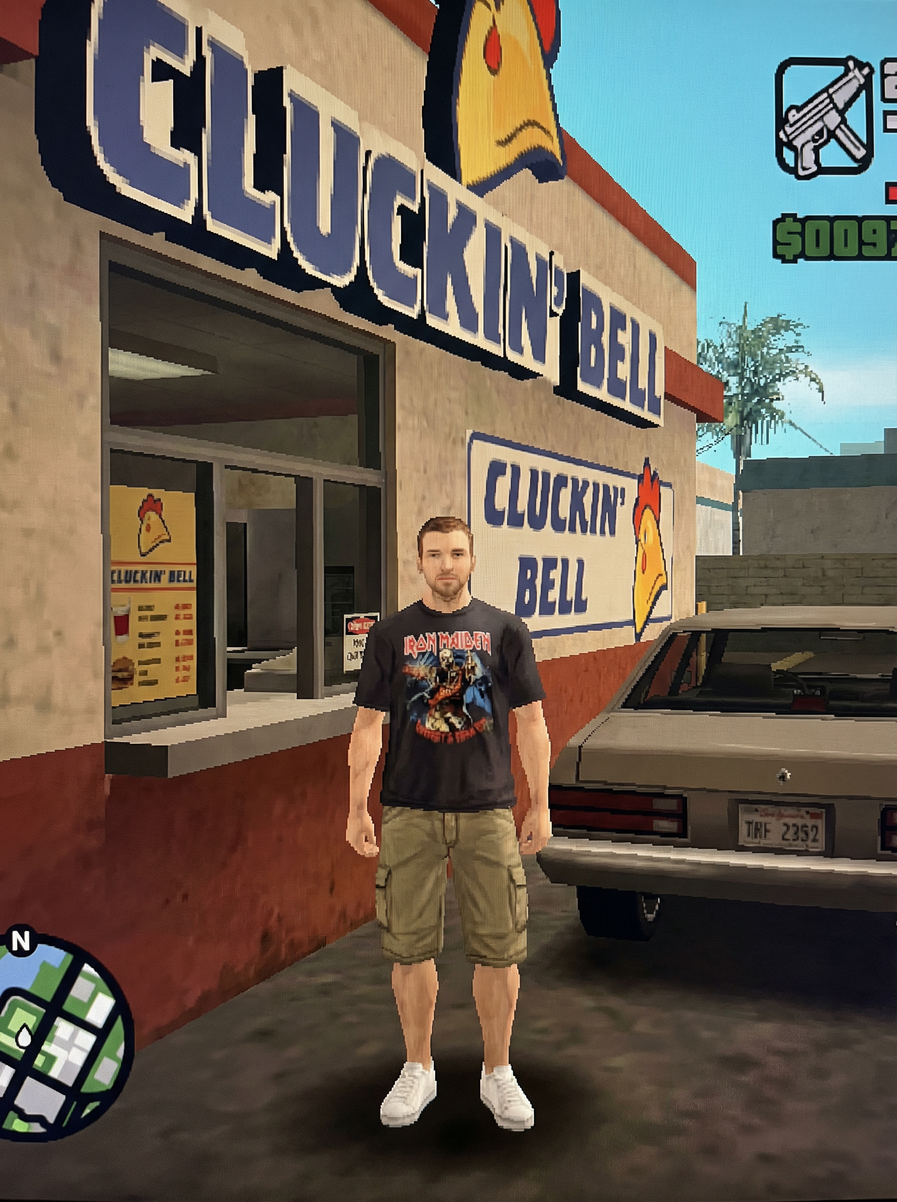 model as character in Grand Theft Auto: San Andreas video game (DO NOT CREATE ILLUSTRATION), at drive-thru restaurant, wearing graphic tee, cargo shorts, sneakers, entire image is in the style of GTA San Andreas (DO NOT MAKE IT A PHOTO)
