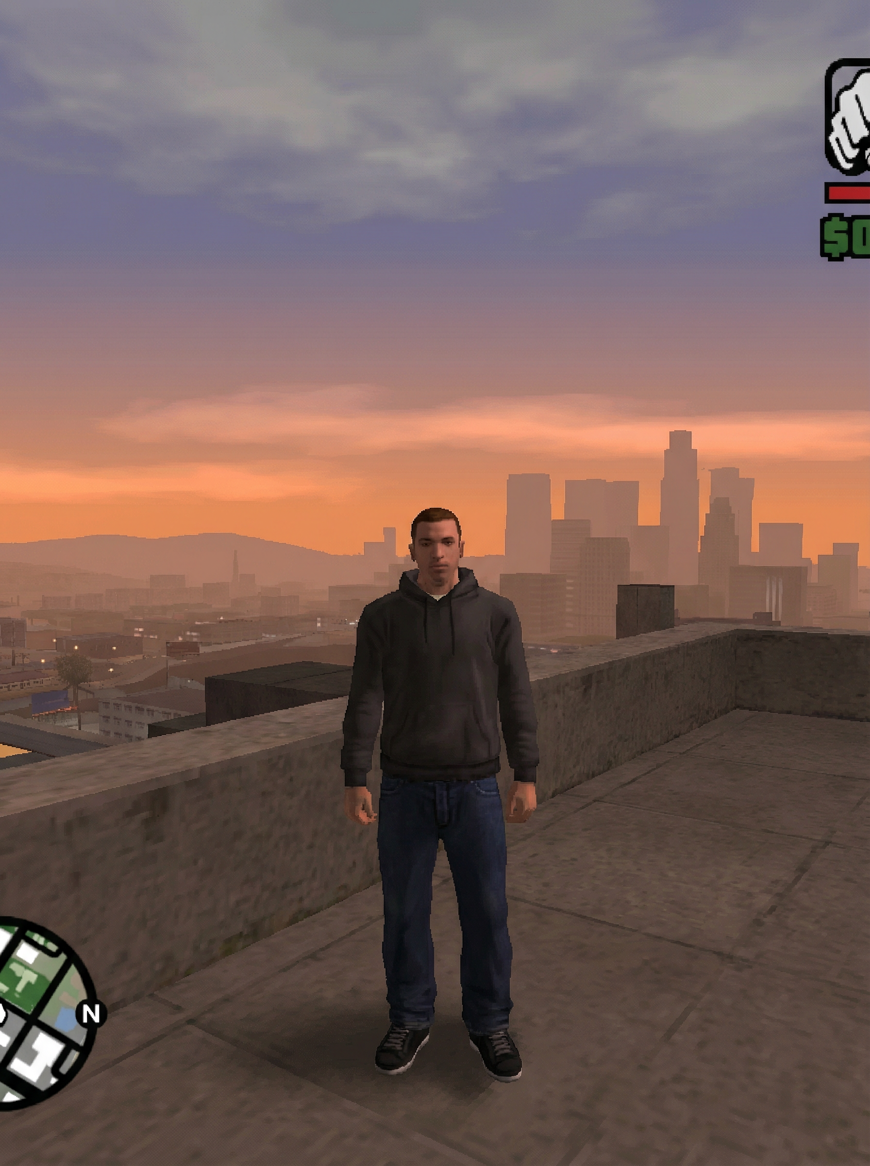 model as character in Grand Theft Auto: San Andreas video game (DO NOT CREATE ILLUSTRATION), standing on rooftop overlooking city skyline, wearing hoodie, dark jeans, sneakers, entire image is in the style of GTA San Andreas (DO NOT MAKE IT A PHOTO)