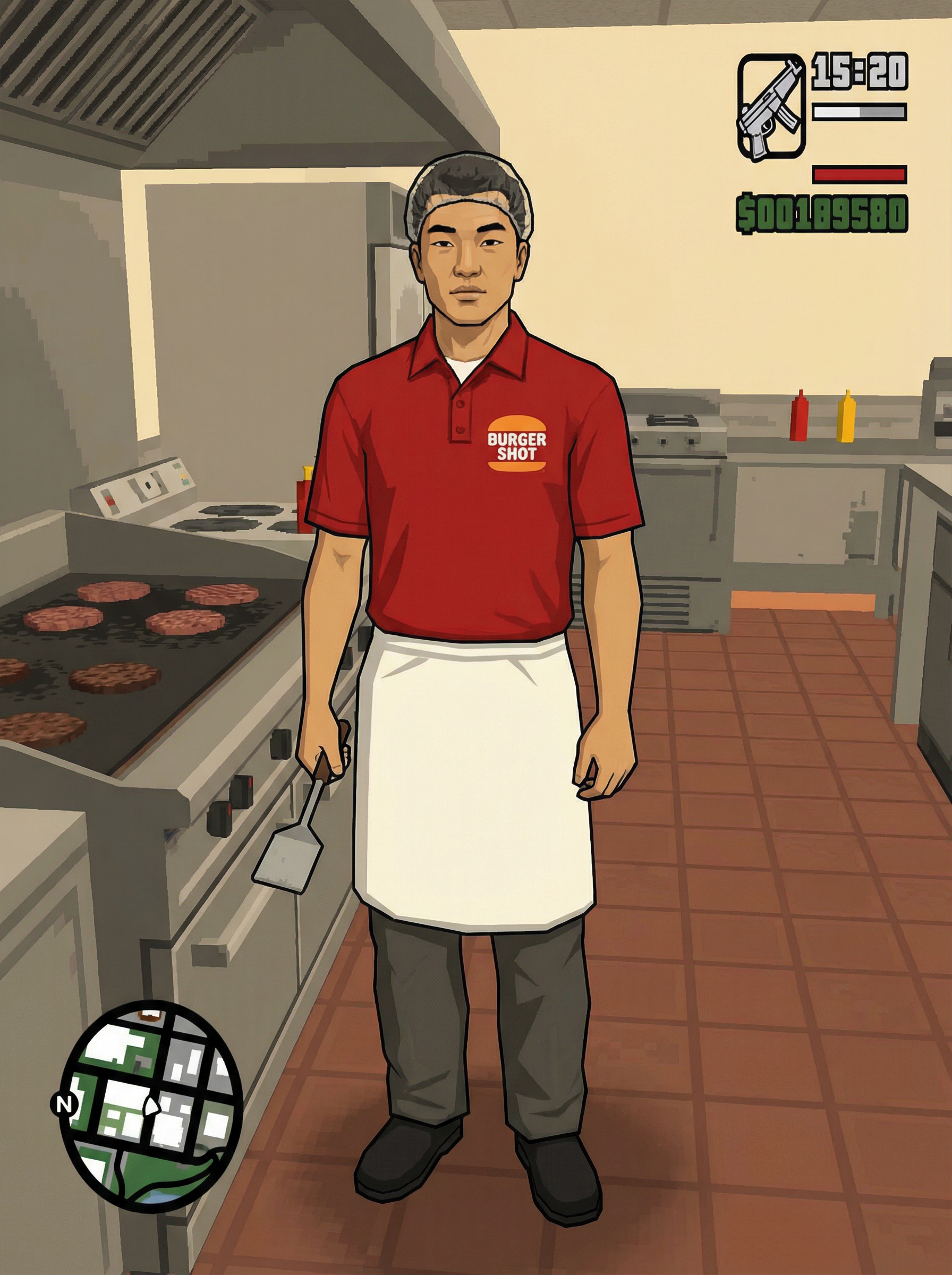 model as character in Grand Theft Auto: San Andreas video game (DO NOT CREATE ILLUSTRATION), in fast food restaurant kitchen, wearing uniform, hair net, apron, non-slip shoes, entire image is in the style of GTA San Andreas (DO NOT MAKE IT A PHOTO)