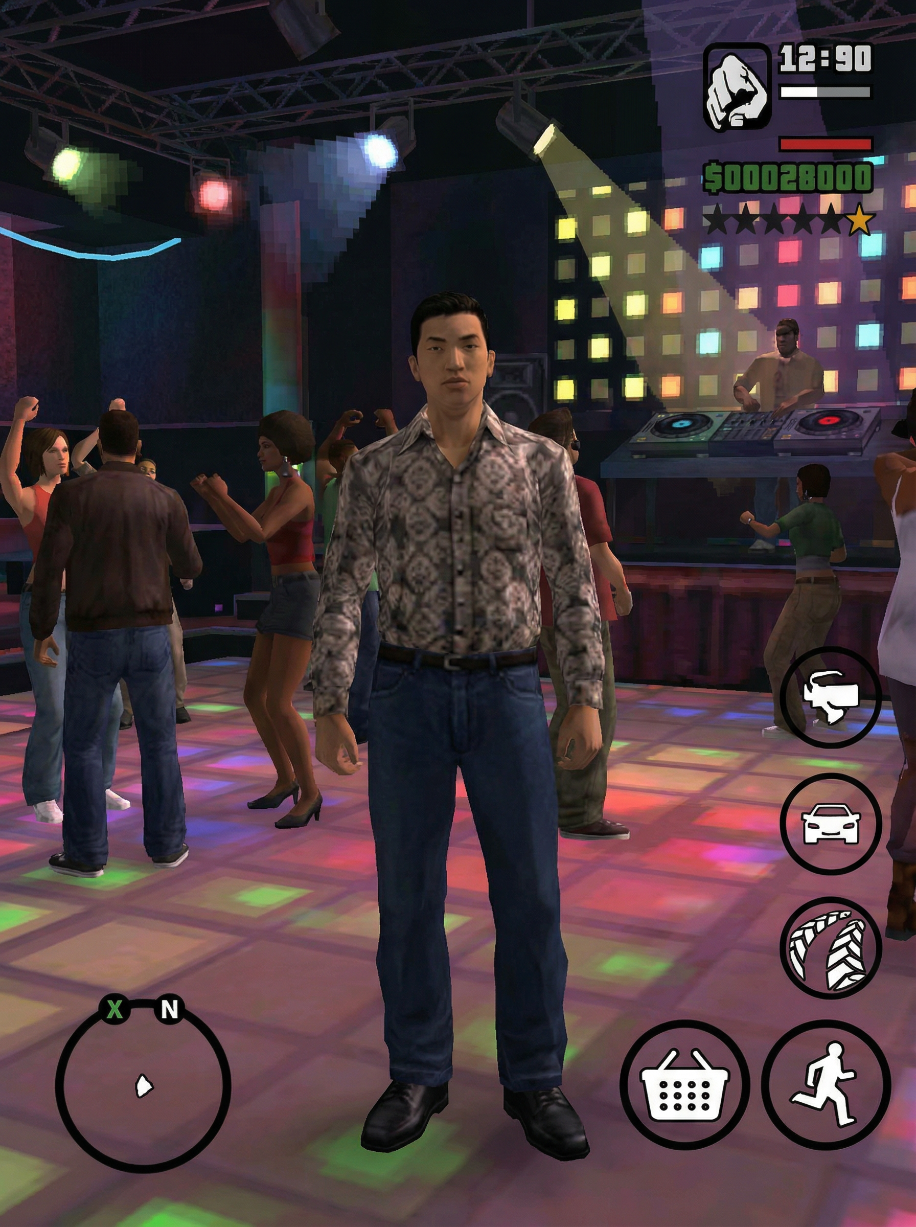 model as character in Grand Theft Auto: San Andreas video game (DO NOT CREATE ILLUSTRATION), at nightclub dance floor, wearing club shirt, dark jeans, dress shoes, entire image is in the style of GTA San Andreas (DO NOT MAKE IT A PHOTO)