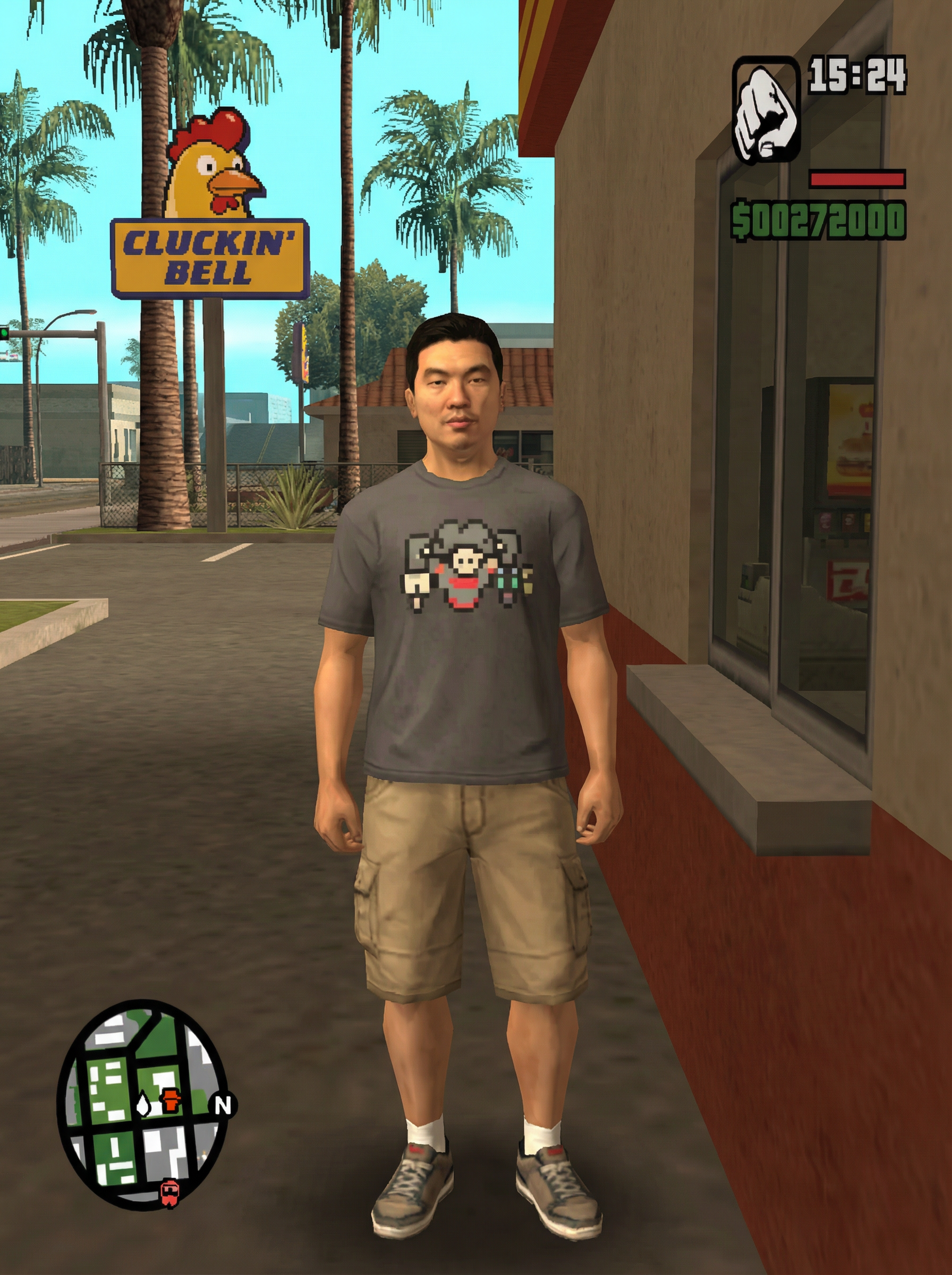 model as character in Grand Theft Auto: San Andreas video game (DO NOT CREATE ILLUSTRATION), at drive-thru restaurant, wearing graphic tee, cargo shorts, sneakers, entire image is in the style of GTA San Andreas (DO NOT MAKE IT A PHOTO)