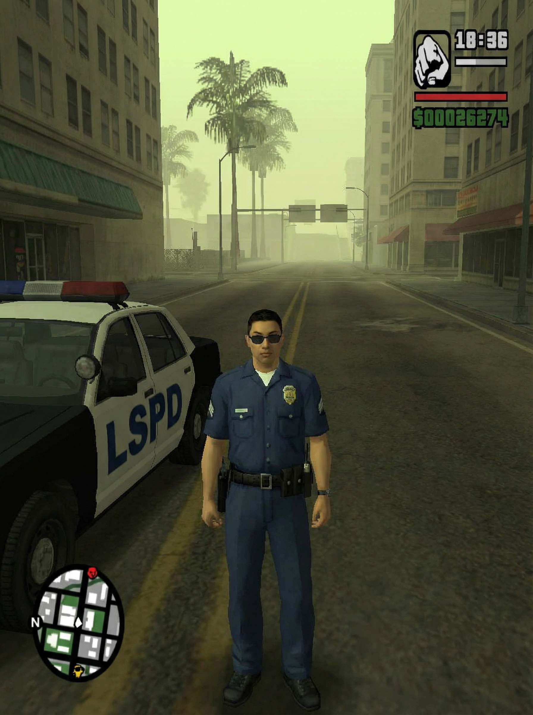 model as character in Grand Theft Auto: San Andreas video game (DO NOT CREATE ILLUSTRATION), next to police car in downtown area, wearing police uniform, badge, utility belt, sunglasses, entire image is in the style of GTA San Andreas (DO NOT MAKE IT A PHOTO)