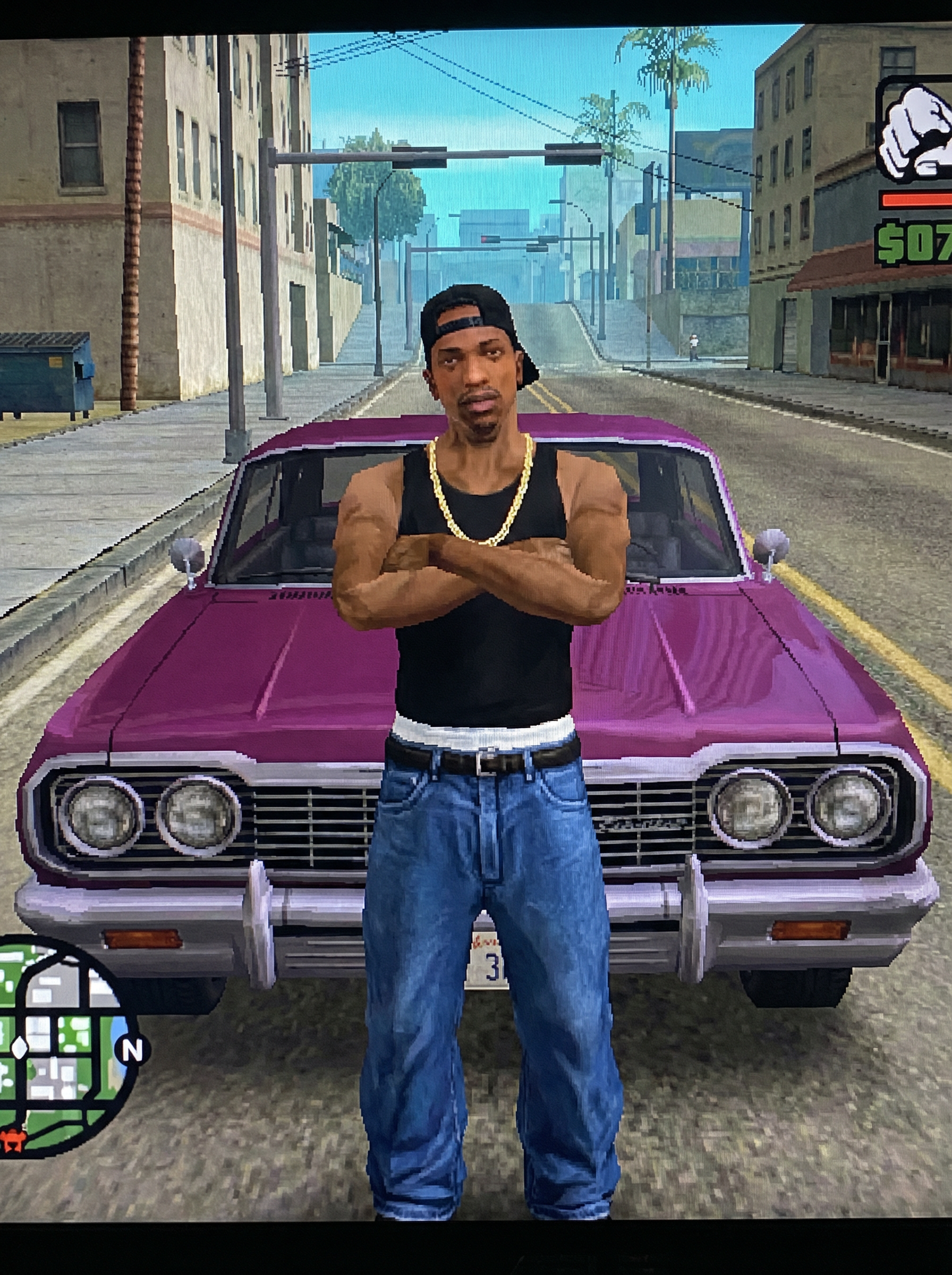 model as character in Grand Theft Auto: San Andreas video game (DO NOT CREATE ILLUSTRATION), standing confidently in front of lowrider car in urban Los Santos street, wearing tank top, baggy jeans, gold chains, backwards cap, entire image is in the style of GTA San Andreas (DO NOT MAKE IT A PHOTO)