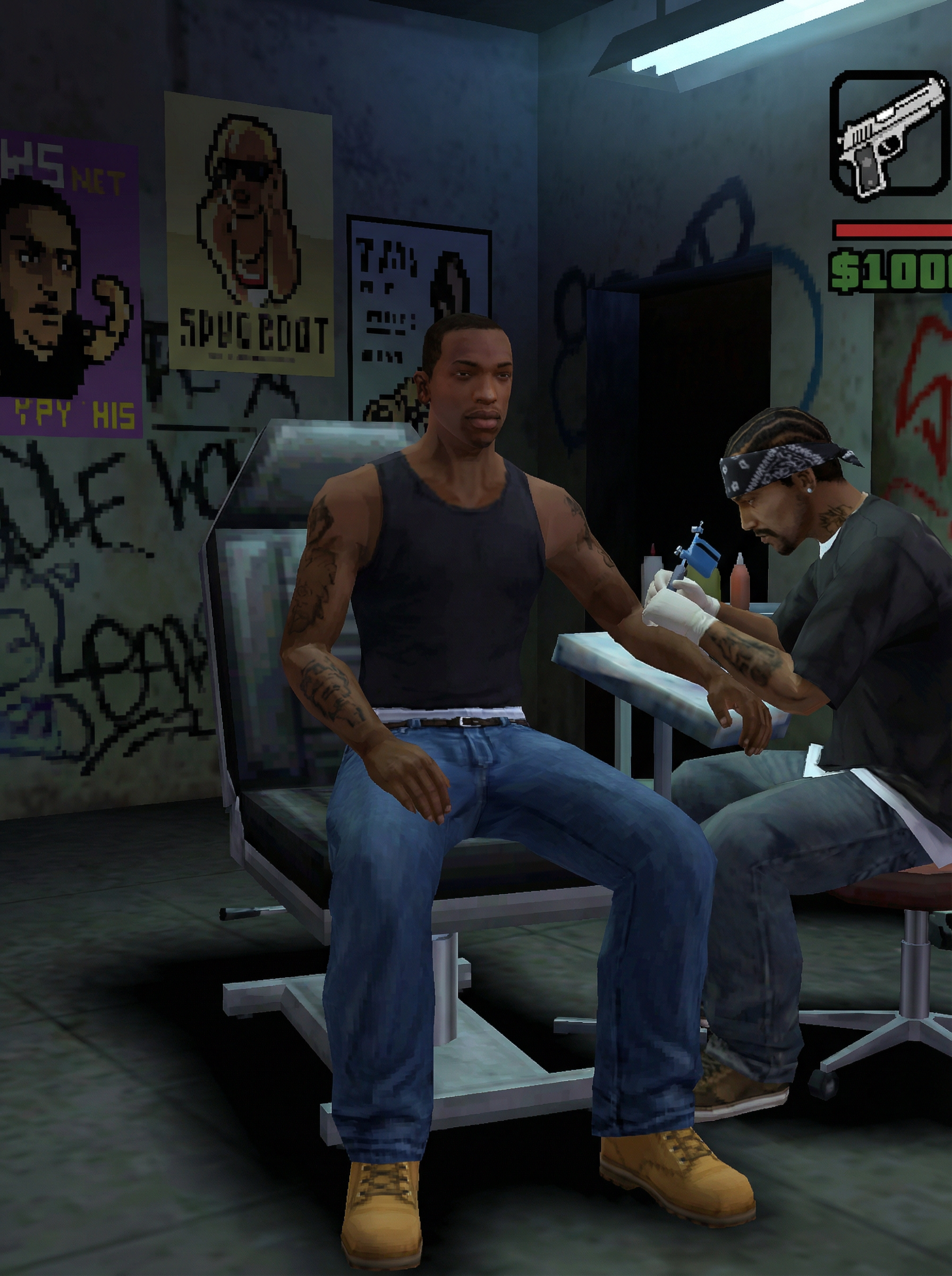 model as character in Grand Theft Auto: San Andreas video game (DO NOT CREATE ILLUSTRATION), at tattoo parlor, wearing sleeveless shirt showing tattoos, jeans, boots, entire image is in the style of GTA San Andreas (DO NOT MAKE IT A PHOTO)