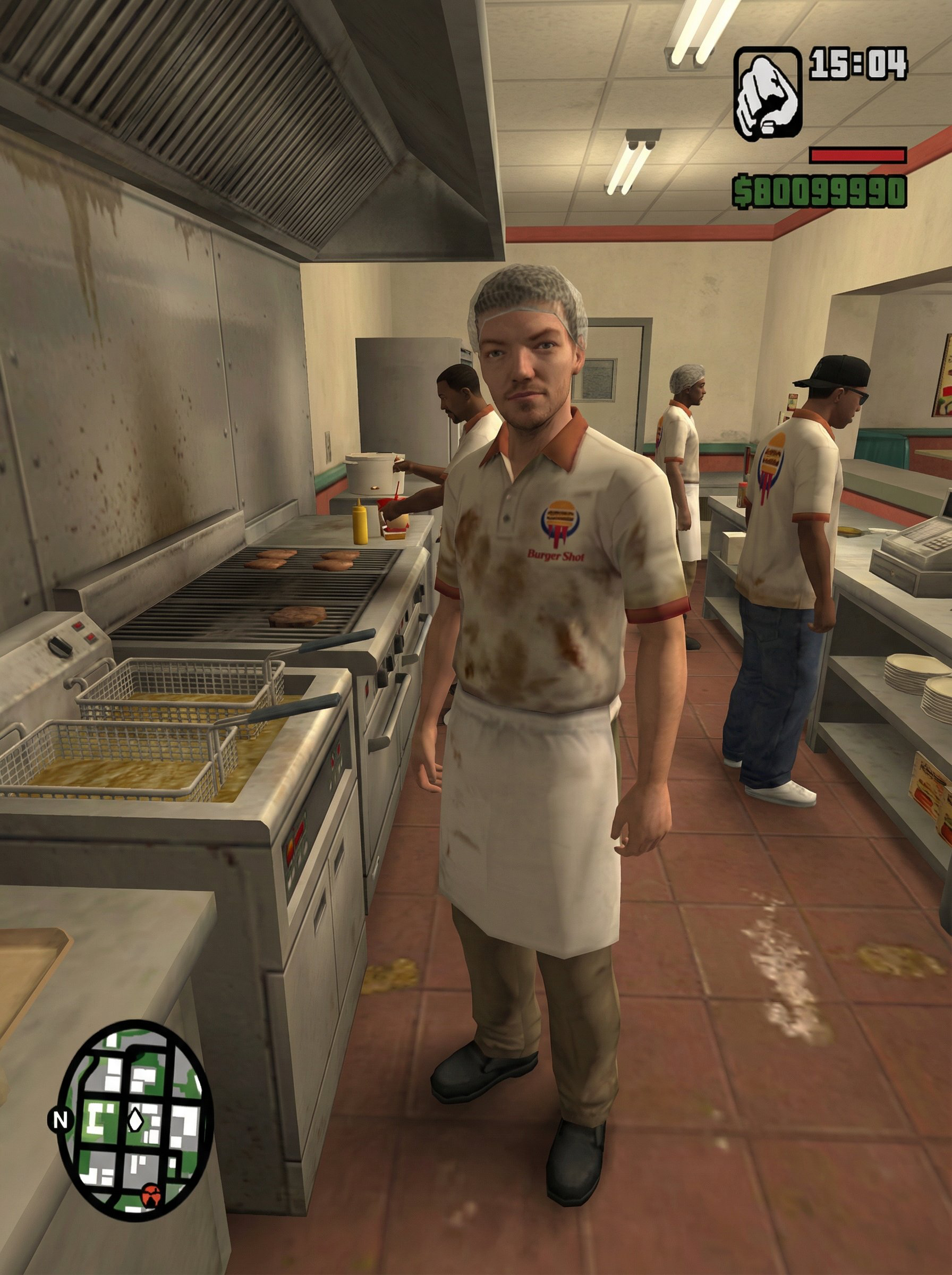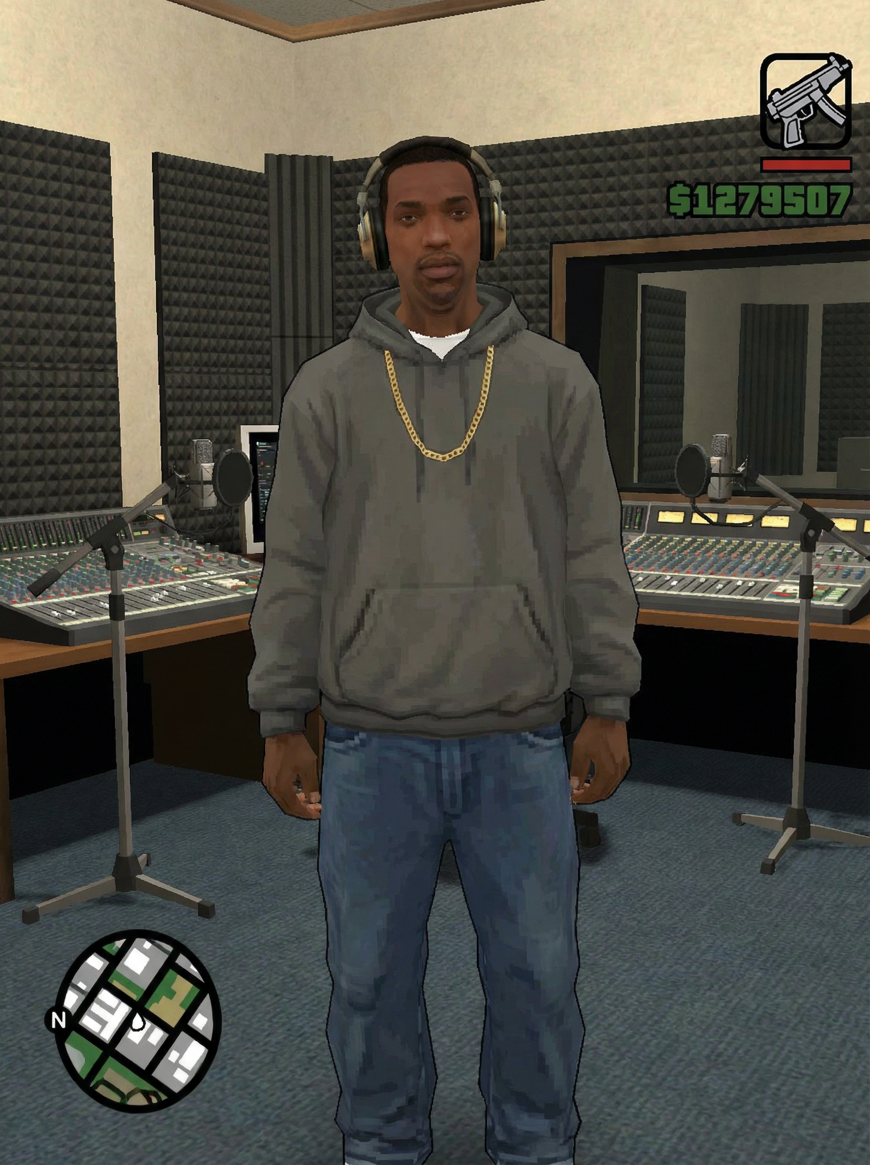model as character in Grand Theft Auto: San Andreas video game (DO NOT CREATE ILLUSTRATION), in recording studio, wearing hip-hop style clothing, headphones, chains, entire image is in the style of GTA San Andreas (DO NOT MAKE IT A PHOTO)