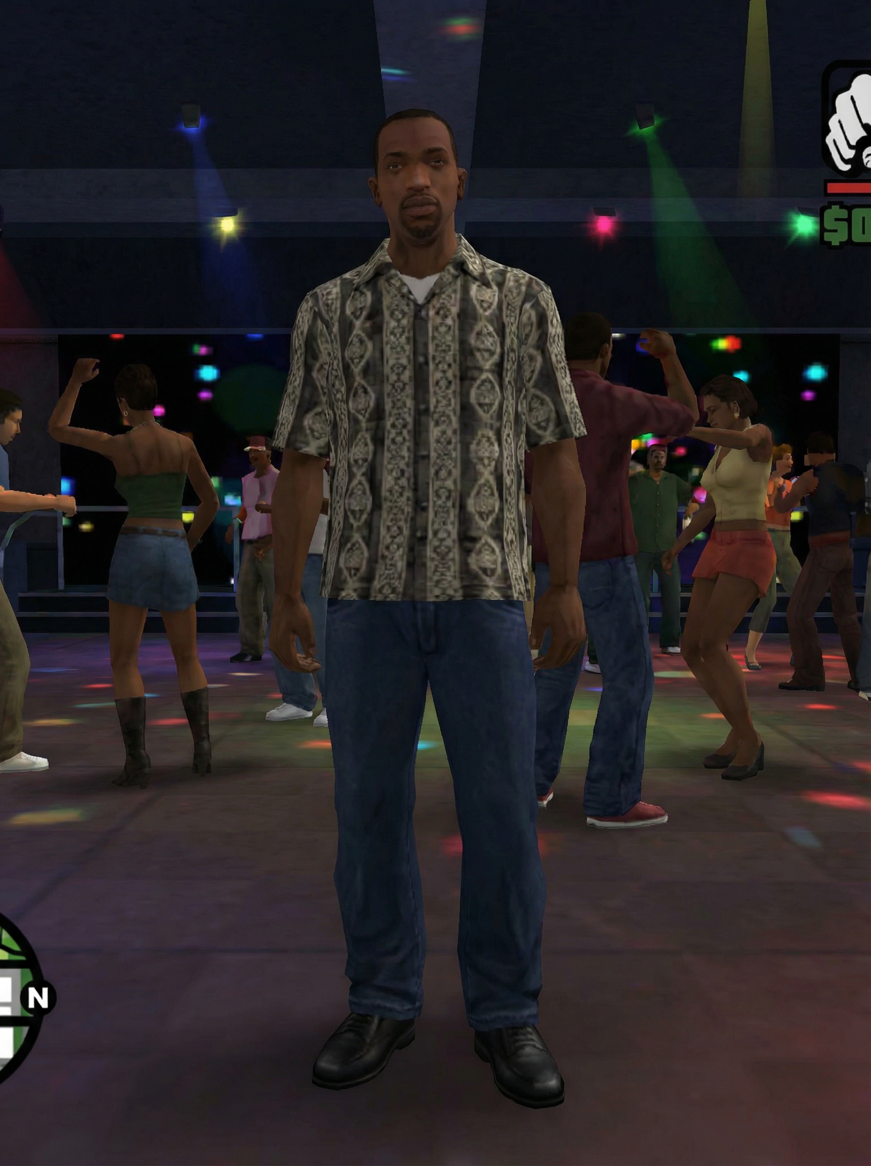 model as character in Grand Theft Auto: San Andreas video game (DO NOT CREATE ILLUSTRATION), at nightclub dance floor, wearing club shirt, dark jeans, dress shoes, entire image is in the style of GTA San Andreas (DO NOT MAKE IT A PHOTO)