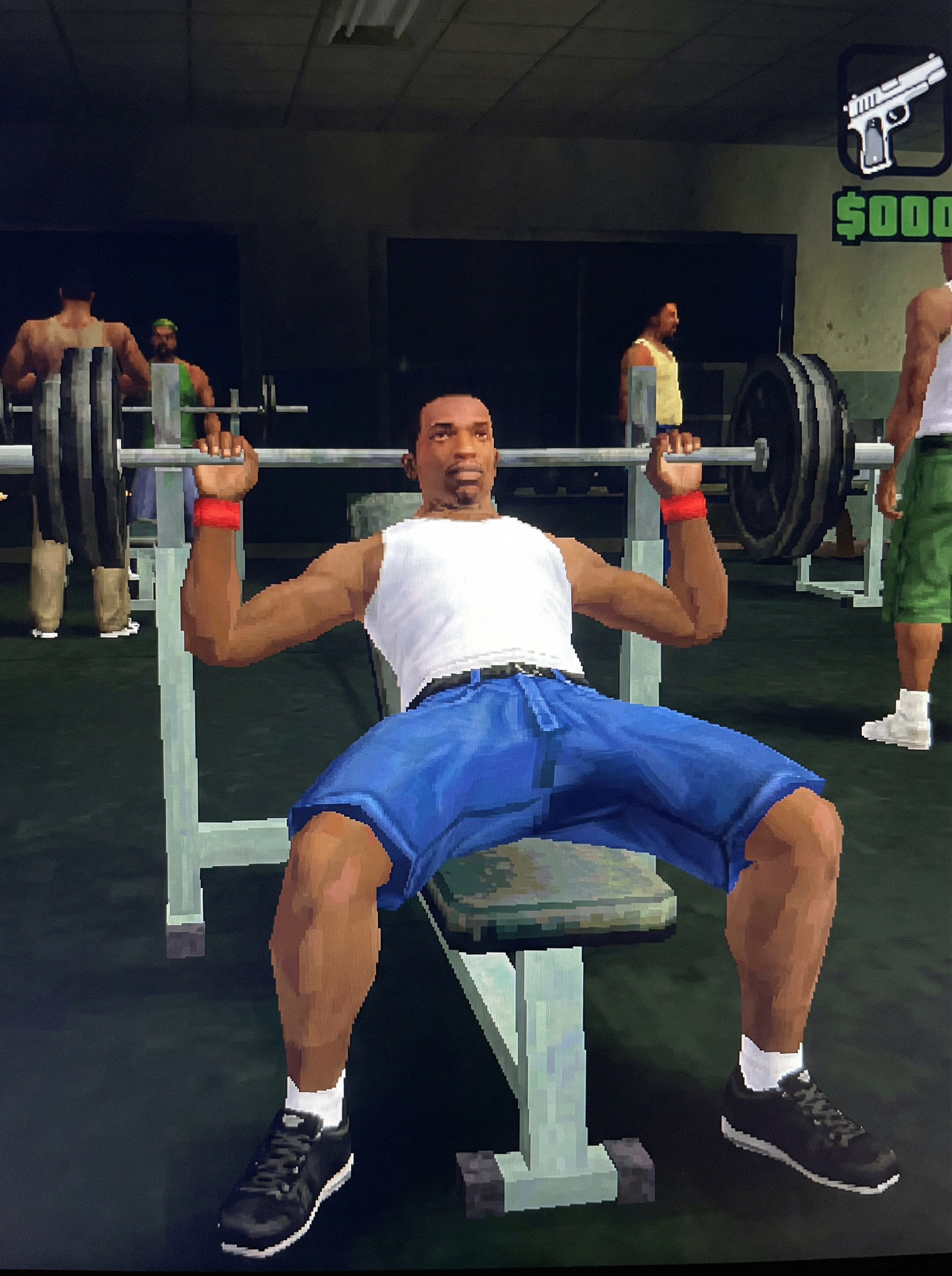 model as character in Grand Theft Auto: San Andreas video game (DO NOT CREATE ILLUSTRATION), in gym working out, wearing tank top, shorts, sneakers, wristbands, entire image is in the style of GTA San Andreas (DO NOT MAKE IT A PHOTO)