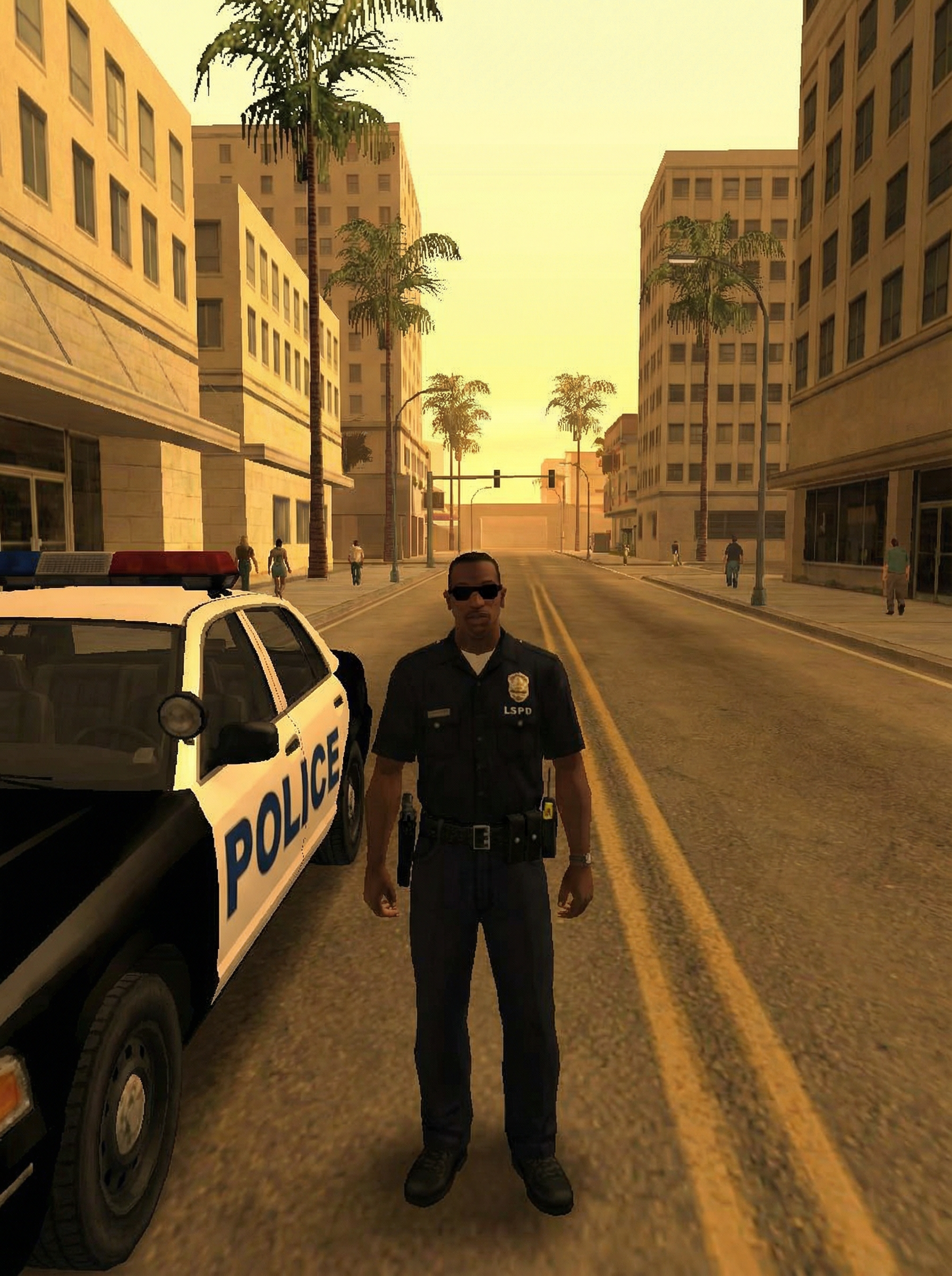 model as character in Grand Theft Auto: San Andreas video game (DO NOT CREATE ILLUSTRATION), next to police car in downtown area, wearing police uniform, badge, utility belt, sunglasses, entire image is in the style of GTA San Andreas (DO NOT MAKE IT A PHOTO)