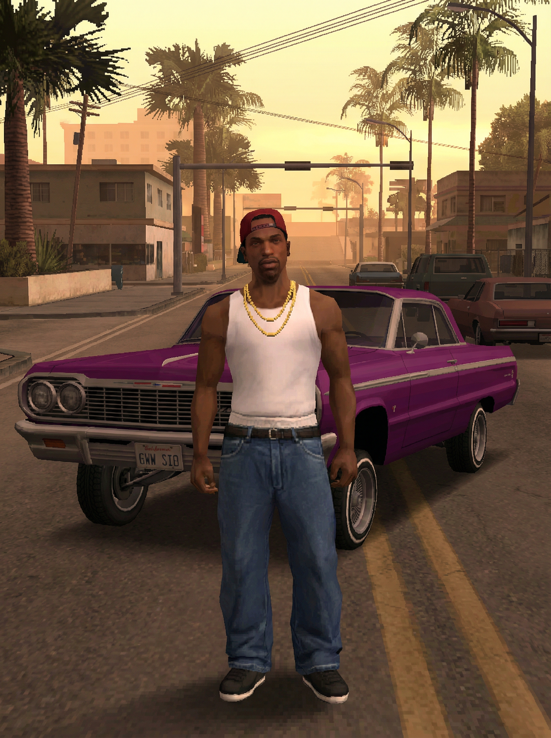 model as character in Grand Theft Auto: San Andreas video game (DO NOT CREATE ILLUSTRATION), standing confidently in front of lowrider car in urban Los Santos street, wearing tank top, baggy jeans, gold chains, backwards cap, entire image is in the style of GTA San Andreas (DO NOT MAKE IT A PHOTO)