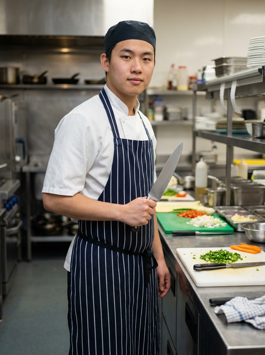 model as chef with knife skills pose, holding chefs knife professionally, clean prep station background