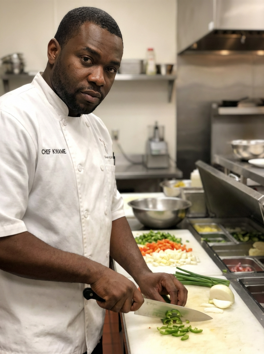 model as chef with knife skills pose, holding chefs knife professionally, clean prep station background