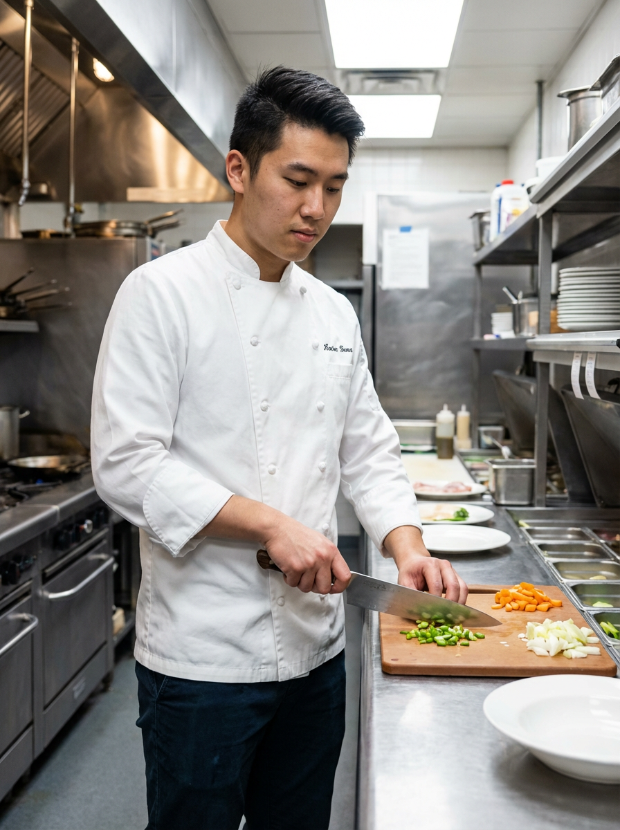 model as chef with knife skills pose, holding chefs knife professionally, clean prep station background