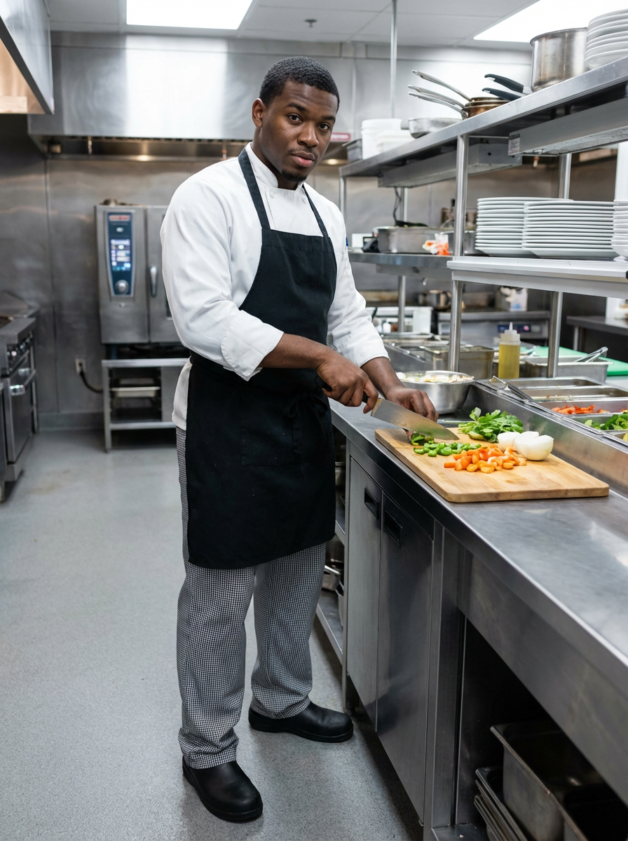 model as chef with knife skills pose, holding chefs knife professionally, clean prep station background