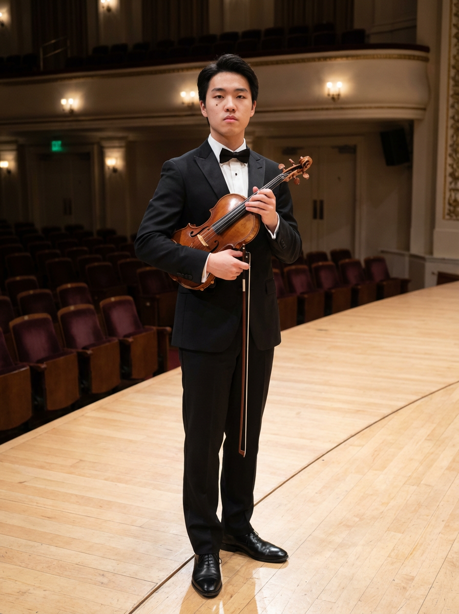 model as classical musician, formal concert attire, elegant sophisticated pose, concert hall background