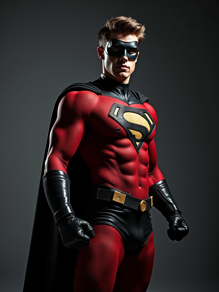 model as comic book hero, studio lights, wearing a bold superhero suit with a mask and gloves, action pose, dramatic shadows