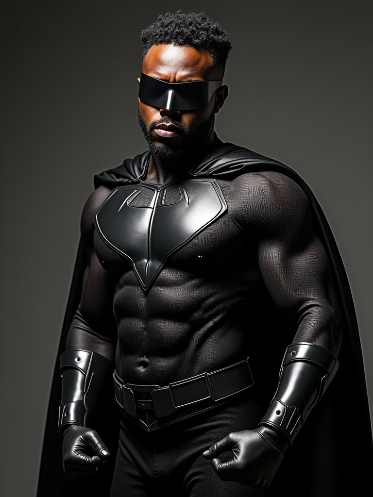 model as comic book hero, studio lights, wearing a bold superhero suit with a mask and gloves, action pose, dramatic shadows